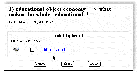 Dynababyl Entries can have an arbitrary number of links attached to them. Links connect the particular entry with either another entry or any other location on the Web. Links are stored in the Link Clipboard.