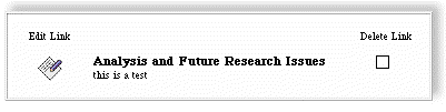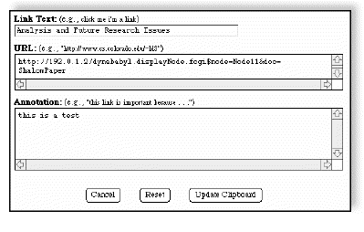 The link clipboard stores a list of links (the clipboard shown above has only one). Users can delete links from the clipboard or edit them in the Link Editor (see below)Another way to create a link is to click on the LinkClipboard Link (always found at the top of the page), and use the link editor to create a link by hand.